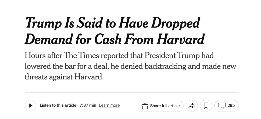 :哈佛校长阿兰·加伯(Alan Garber)公开拒绝政府要求,称其“超越了政府权力,侵犯了学术自由”。