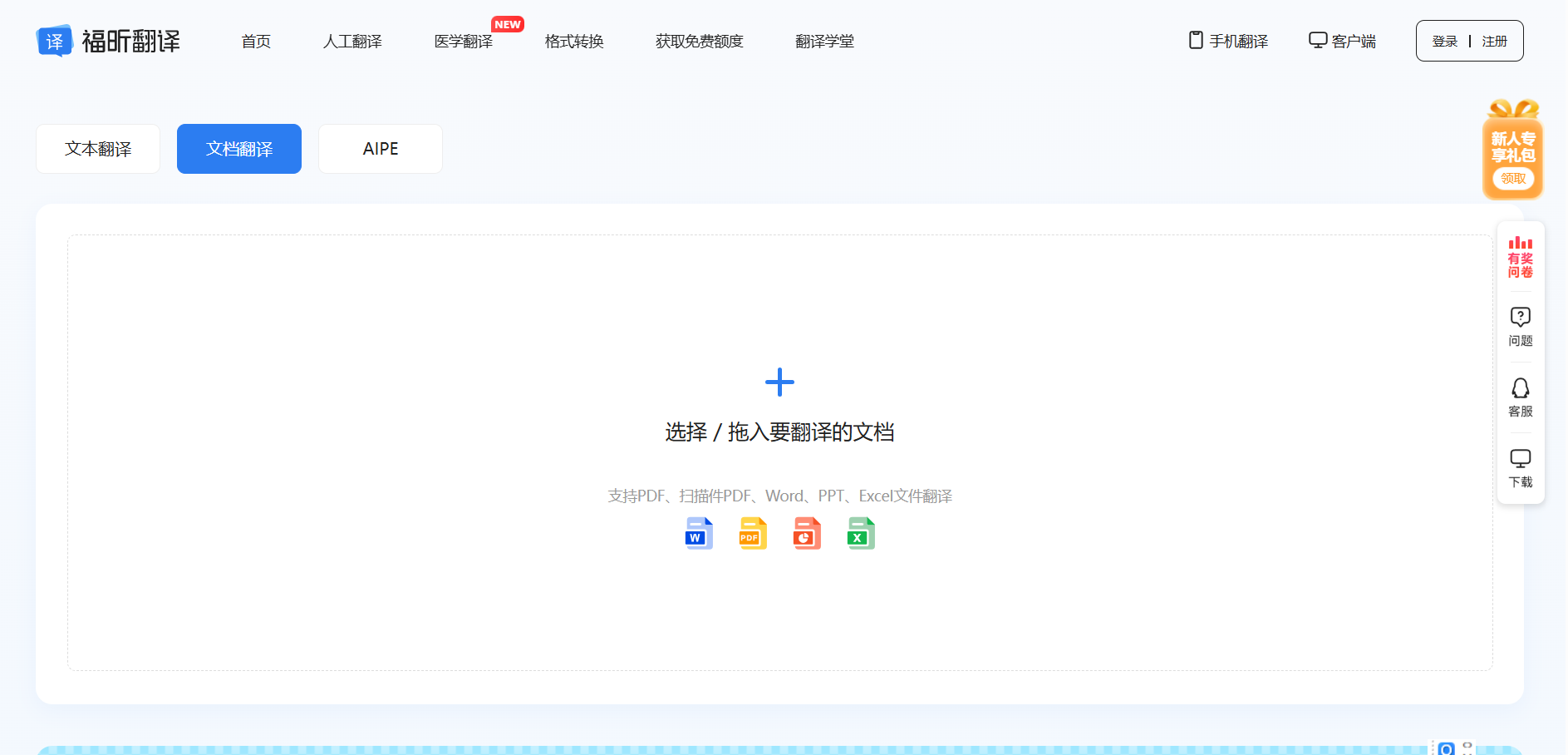 - 打开福昕在线翻译官网,找到“PDF文档翻译”板块;